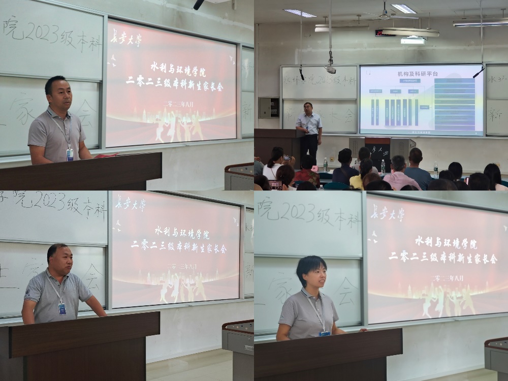 2023级本科生新生家长会在渭水校区WM1201教室召开,学院党委书记邓红章、党委副书记王妍、副院长卢玉东、副院长段磊以及新生家长参加会议。会议由王妍主持。