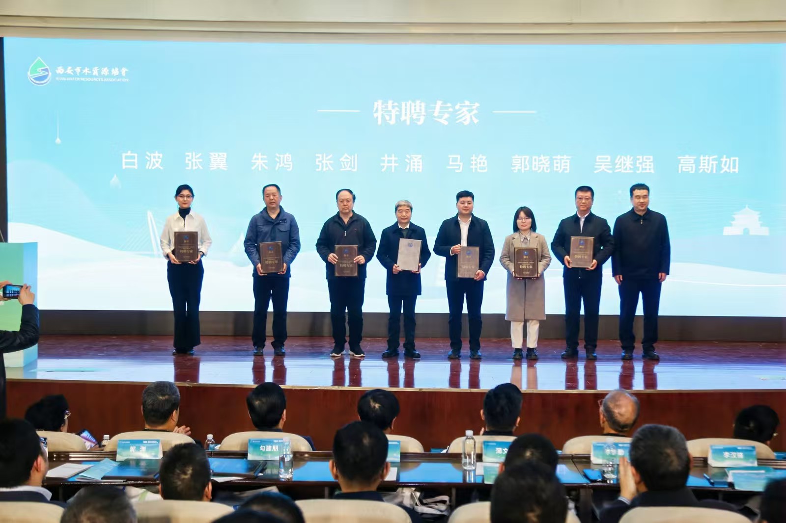 彭建兵院士受聘为协会荣誉会长,钱会教授被选举为西安市水资源协会第一届会长并作就职发言,张骞文、白波受聘为协会监事长和特聘专家,参会领导为文轩探花