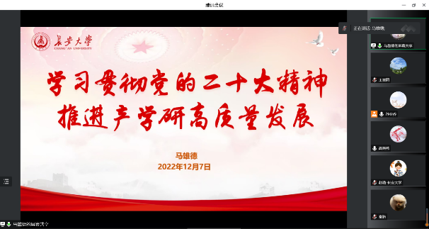 12月7日,水环实验中心党支部举办学习贯彻党的二十大精神主题党课学习活动,支部党员马雄德和高燕燕分别做了题为《学习贯彻党的二十大精神,推进产学研高质量发展》和《加快建设高质量教育体系,办好人民满意的教育》的主题报告。会议由支部书记孙亚乔主持,支部全体党员及水环中心全体教师参加了本次会议。